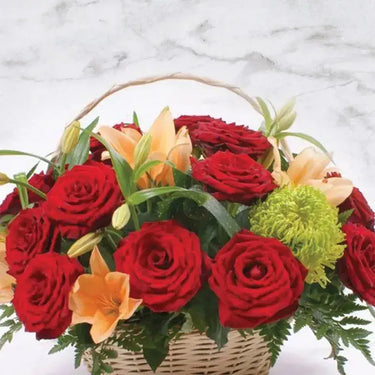 A timeless romantic gesture, this exquisite arrangement presents luscious red roses artfully arranged in an elegant handwoven basket. Perfect for anniversaries, Valentine’s Day, or heartfelt apologies, this luxurious gift combines passionate blooms with rustic charm for a truly memorable presentation.